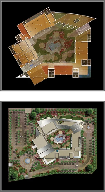 قدم مكتب دلتـــا مهندسون استشاريون خطوطا معمارية حرة ذات انسجام وظيفي ترفيهي حيث انســــجمت العنـــــاصر الخـــــاصة بالمشروع مع بعضها البعض حول فناء مشبع بالزهور ومسطحات الماء لتعكس بيئة مضادة للعمل وتكوين الاسترخاء ..