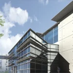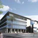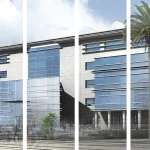 قدم مكتب دلتـــا مهندسون استشاريون لهذا المستشفى الكتل المنفصلة والتركيبات الزجاجية الخارجية ذات الإشراقة المستطيلة مع التظليلات برقائق الألمونيوم الحادة على كامل واجهات المبنى لتحقق التكامل بين المناخ وكسب الإضاءة من الداخل .