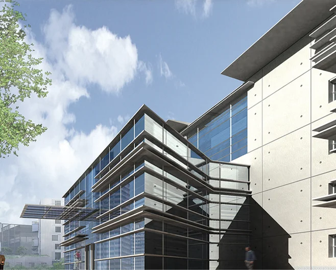 قدم مكتب دلتـــا مهندسون استشاريون لهذا المستشفى الكتل المنفصلة والتركيبات الزجاجية الخارجية ذات الإشراقة المستطيلة مع التظليلات برقائق الألمونيوم الحادة على كامل واجهات المبنى لتحقق التكامل بين المناخ وكسب الإضاءة من الداخل .